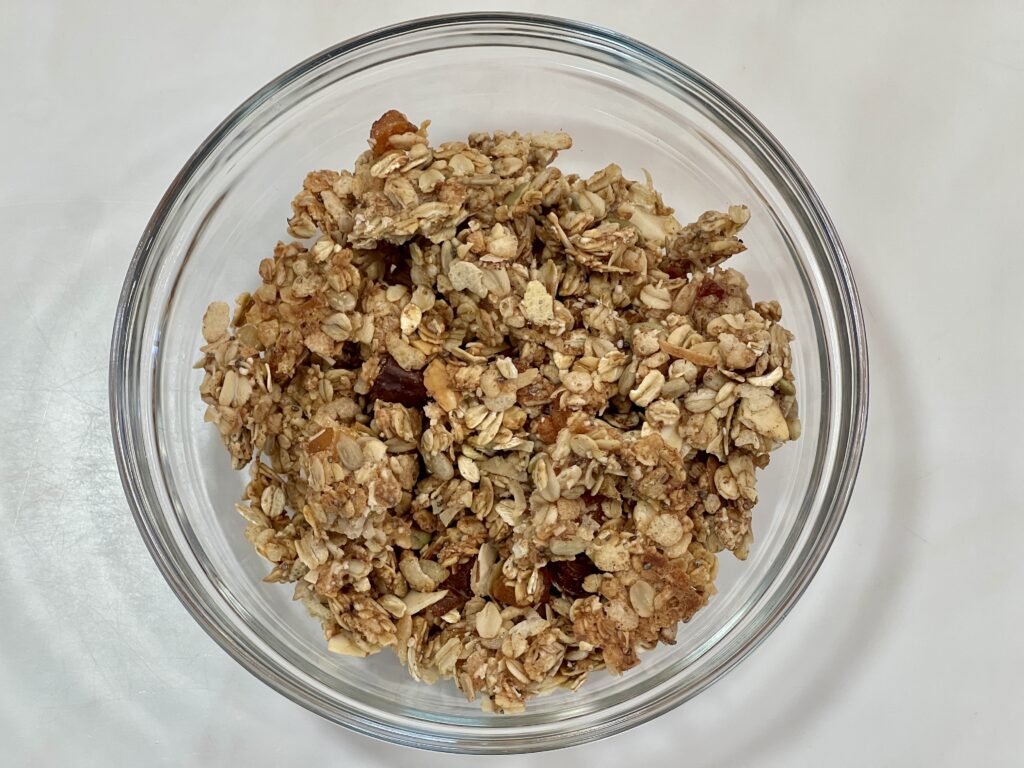 → Sourdough levain, oats, puffed rice, cinnamon, salt, coconut oil, vanilla, honey, maple syrup, dried apples, dried dates, dried apricots, coconut flakes, chia seeds, sunflower seeds, almonds